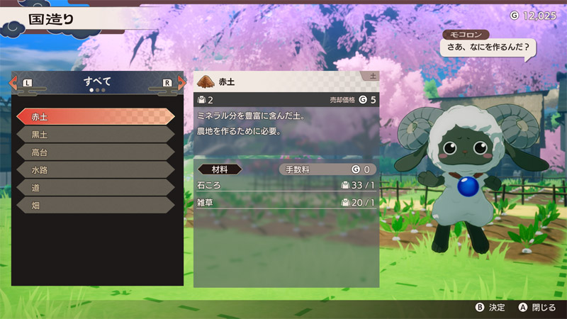 住人の力を借りて、里をより豊かに発展させていきましょう。クラフト「道」や「畑」「水田」などの地形パネルはモコロンにお願いすることで作成できます。