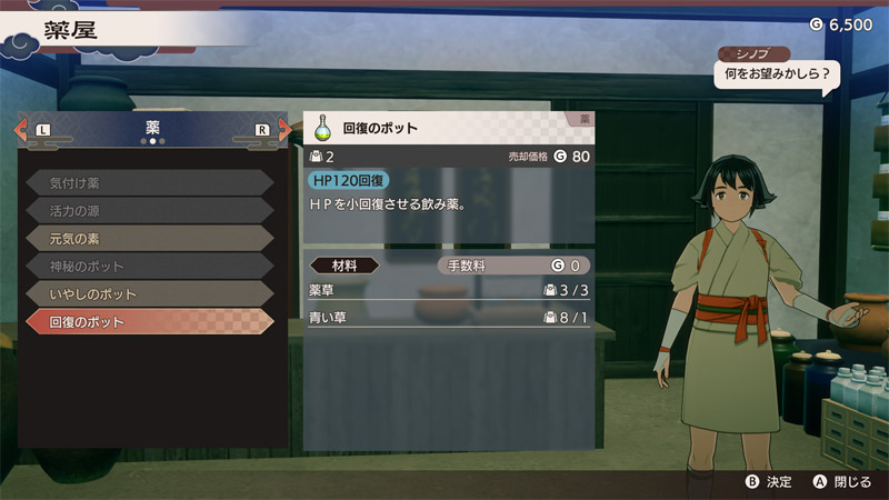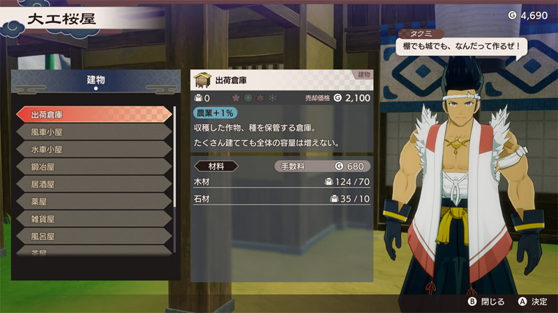 工務店では「建物」や「置物」が、また薬屋では「薬」を作ることができます。