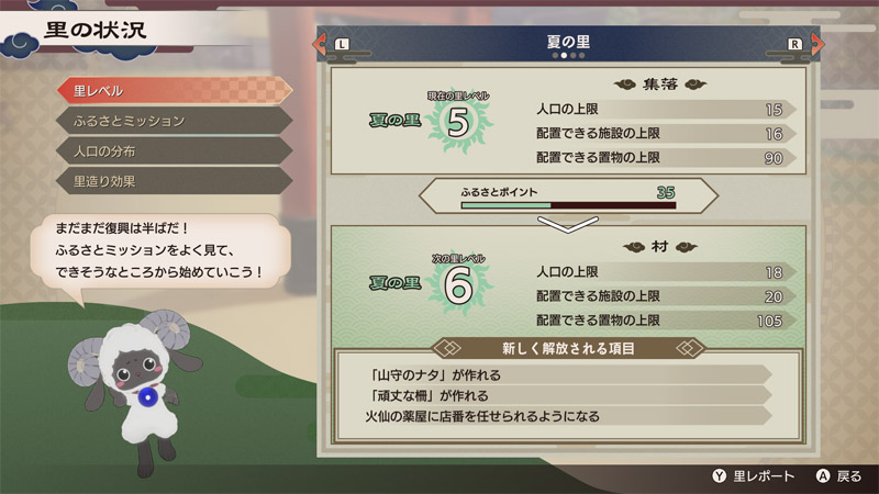 里レベルが上昇することで作成可能な建物が増えたり、受け入れ可能な住人数が増えていきます。